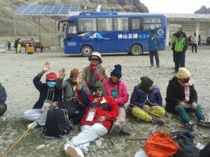 इसको बनाया गया था ।हमारी बसों के साथ ही हमारी सुरक्षा के लिए लगी पुलिस जीपों ओर एंबुलेंस भी रुक गई।कई यात्रियों ने उनसे संवाद की कोशिश की मगर शायद भाषा का बहाना के कर किसी ने भी हमारी किसी बात का उत्तर नहीं दिया।अब इस बात में कोई संदेह नहीं रह गया था कि चीनी भारतीयों को अविश्वास की नजरों से ही देखते हैं।शायद उन्हें भी आदेश होगा की वे यात्रियों से घुले मिले नहीं और एक बात, वे हम यात्रियों को विश्राम स्थलों से बाहर भी नहीं जाने देते थे।यानि की धार्मिक यात्रा के केदी जैसे की हमारी स्तिथि थी!खेर हमें क्या।हम तो भोले भंडारी के दर्शनों के लिए ही उत्सुक थे। भोजन के लिए रुके तो हम यह देख कर हैरान रह गए की हमारे साथ भारत से आए रसोइयों ने सुबह हम से भी पहले ना जाने कब उठ कर भोजन बना लिया था और हॉट केस में से अब गरमागरम भारतीय भोजन हमें परोस दिया गया था।भोजन के पश्चात फिर से हमारी यात्रा आरंभ हो गई और उसी बलखाती निर्जन सड़क पर लगातार चलते चलते शाम 4 बजे तक पिछली रात की ही तरह गेस्ट हाउस में पहुंच गए।