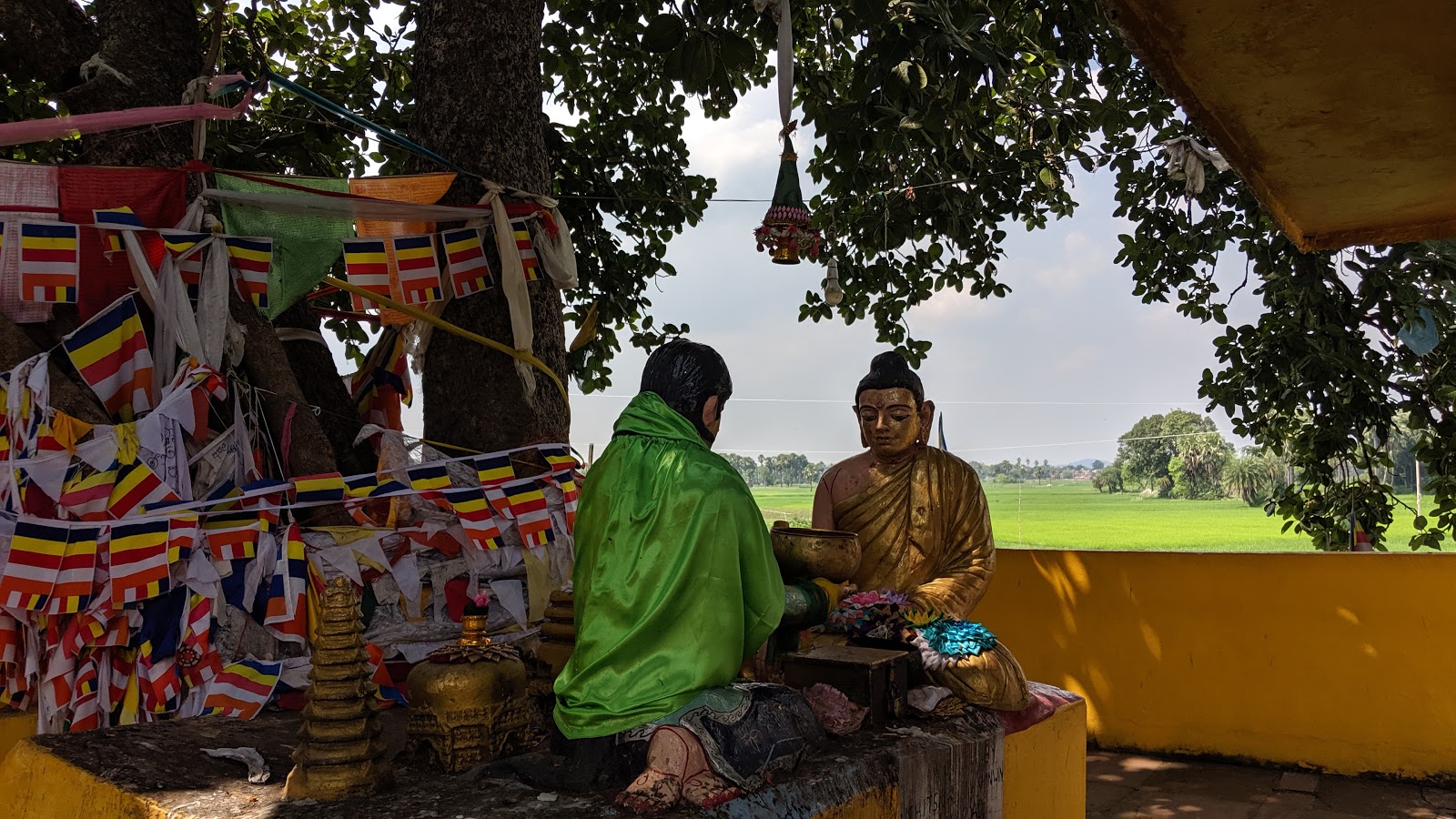 ,लाल पक्की इंटों से निर्मित ,लेकिन भग्न अवस्था में स्तूप बना था।इस स्तूप का घेरा ही लगभग 200 मीटर था,ऊंचाई 40 फीट के लगभग थी,परन्तु इस निर्माण में एक विशेष बात थी कि यह स्तूप मध्य में खाली था! मगर क्यों ,इसका उत्तर ना तो गाइड के पास था और ना ही पुरातत्व विभाग के द्वारा लगाया गया बोर्ड कुछ बता पा रहा था।बहुत देर तक हम कल्पनाओं में डूबने के पश्चात् उस स्थान हेतु रवाना हुए , जहां सुजाता ने बुध को खीर खिलाई थी। कोई 10 किलोमीटर की यात्रा के पश्चात् शहर की चहलपहल से दूर एक शांत ,निर्जन से स्थान पर रिक्शा रुका । एक टीले पर सफेदी से पुते,3 या 4 प्राचीन मंदिरों का समूह ,नजदीक ही छोटा सा सरोवर, और थोड़े से ही यात्री ,एवम् चारों ओर पेड़ों से घिरा, ये हमें बोध स्तूप ना लगकर हिन्दुओं का आश्रम जैसा लग रहा था।एक बहुत ही विशाल वट वृक्ष ने , अपने पूरे वितान को इस सम्पूर्ण आश्रम के ऊपर एक छाते के सदृष फैलाया हुआ था।एक और बात ने हमारा ध्यान आकर्षित किया कि इस स्थान पर आए यात्रियों में कोई भी बुध धर्म का अनुयाई नहीं था,फिर समझ में आया कि वे सब जिस और जा रहें है वह तो वास्तव में एक आश्रम ही है ।