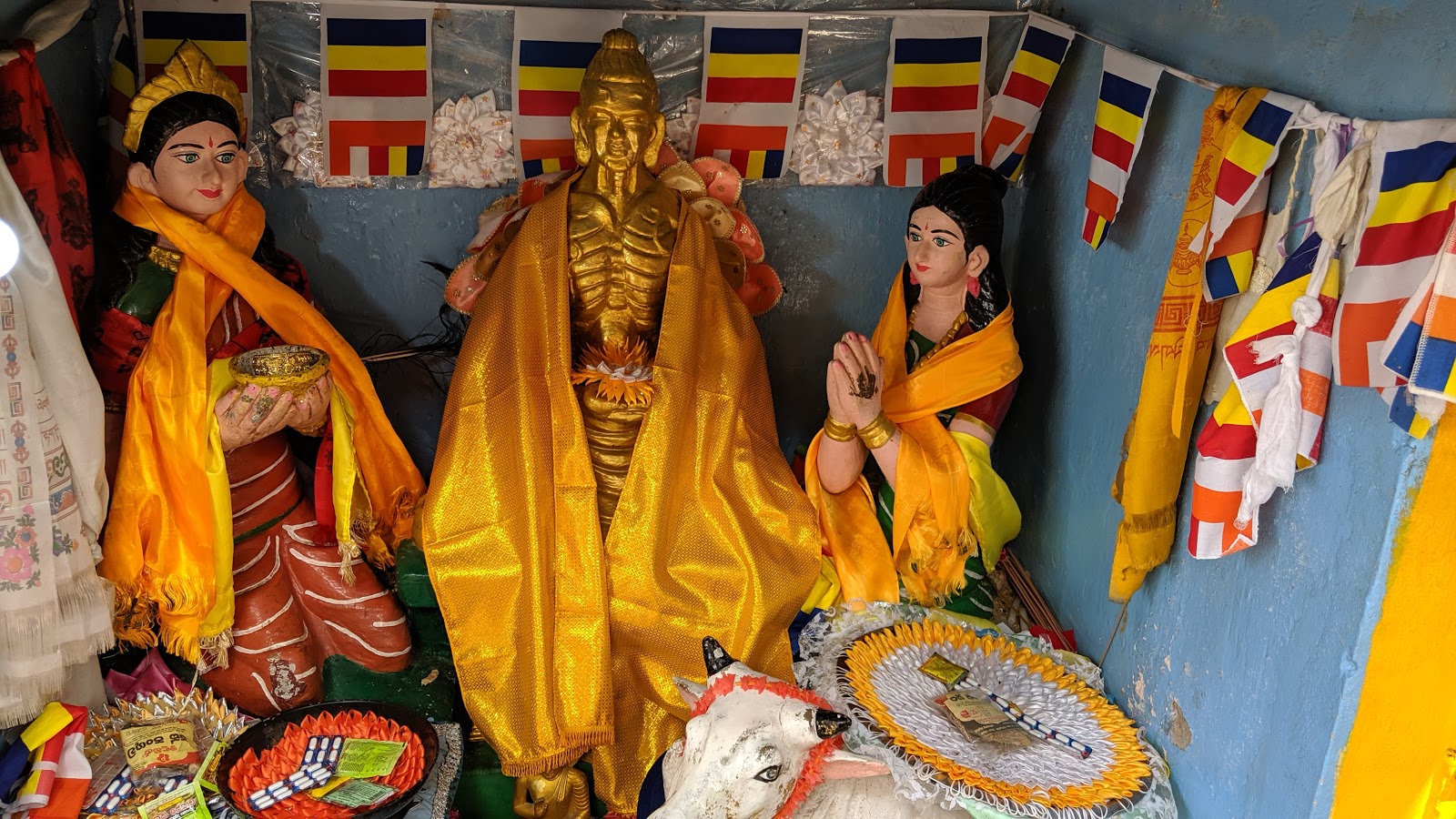 अब ये स्तूप चाहे चीन,जापान या अन्य किसी भी देश ने बनवाए हो,सबके मध्य एक विशेष समानता थी कि स्तूप के मध्य में पीले रंग की विशाल काय ,महात्मा बुद्ध की मूर्ति ध्यान अवस्था में, आंखे बंद किए,मंद मंद मुस्कुराते हुए एक अलौकिक आभा और शांति के विहंगम रूप का अनुभव प्रदान कर रही थी।प्रत्येक स्तूप अपने निर्माण करता देश की पूजा की विधि और पूजन में उपयोग होने वाली सामग्री से भरा हुआ था।