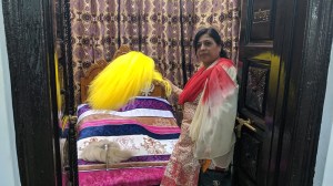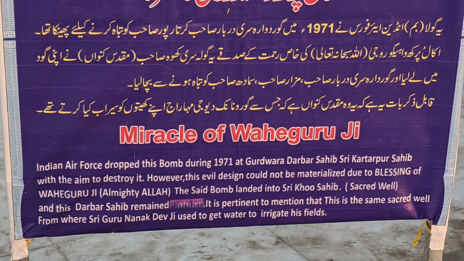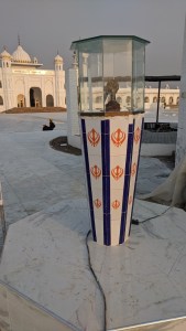 तभी हमें इस कुंए के साथ ही एक बड़ा चबूतरा दिखाई दिया जो की कलात्मक ढंग से चित्रित एवम् संगमरमर के पथरों से ,खूबसूरती के साथ बना हुए था। इस 2 फुट ऊंचा,15 फुट लंबा एवम् 15 ही चोड़ा था।कुछ श्रधालु,इसकी दंडवत प्रणाम करके मीठे का प्रसाद बांट रहे थे।इस बरामदे के अंत में एक बोर्ड टंगा था जिस पर उर्दू ओर पंजाबी यानी गुर्मुखी भाषा में कुछ लिखा था।आखिर कार हमने एक श्रद्धालु से इस बोर्ड के बारे में पूछा तो उसने बताया कि इसी चोकी के नीचे श्री गुरु नानक जी के अंतिम संस्कार के पश्चात् उनके फूल अर्थात अस्थि , राख को रखा गया था।हमने अभिभूत से होकर,उस चबूतरे को हाथों से स्पर्श किया,फिर झुका कर माथे को उस पर स्पर्श कर के अपने को धन्य किया।तभी हमें इस कुंए के पास एक और बोर्ड तथा एक छोटी सी मीनार दिखाई दी। इस मीनार के ऊपर एक मोर्टार बम्ब रखा हुआ था जिसे शीशे के पारदर्शी गुम्बंद में रखा गया था।बोर्ड को पढ़ कर उसकी विषय वास्तु स्पष्ट हो गई ,जिस के सम्बन्ध में में कोईटिपण्णी में यहां नहीं लिखूंगा ।पाठक स्वयं समझदार हैं।इस बोर्ड को पढ़ कर पाकिस्तान के इरादे स्पष्ट हो जाते हैं।
