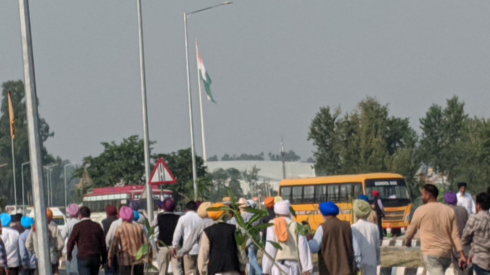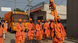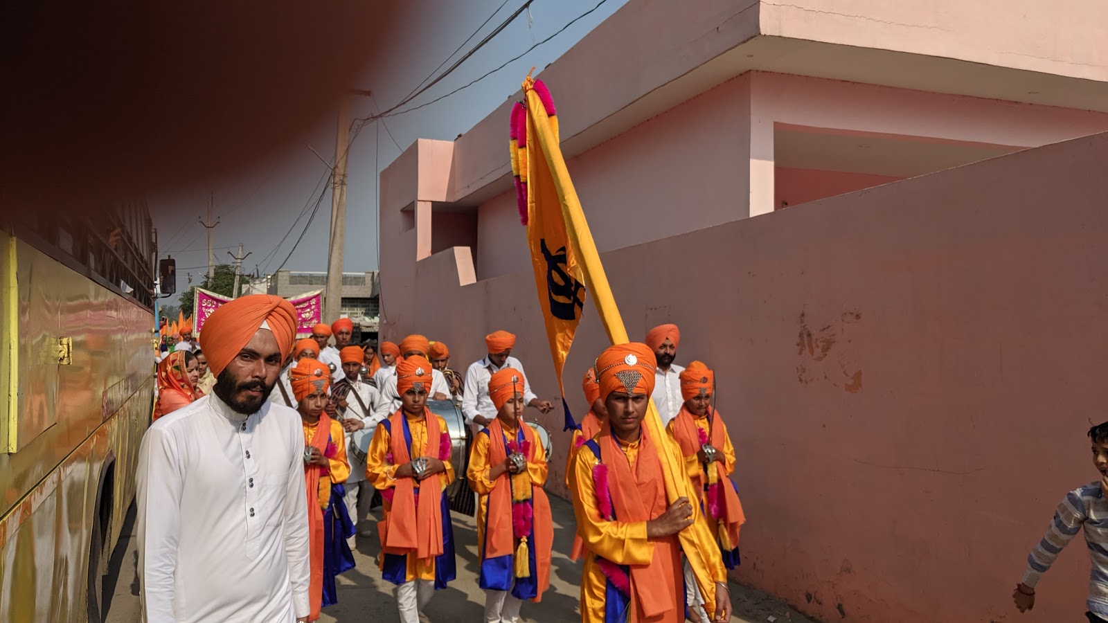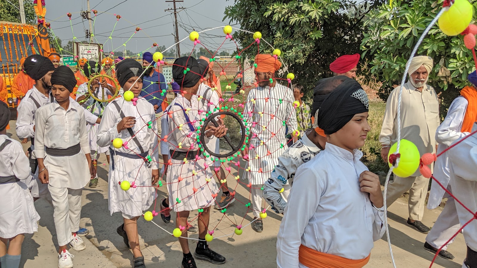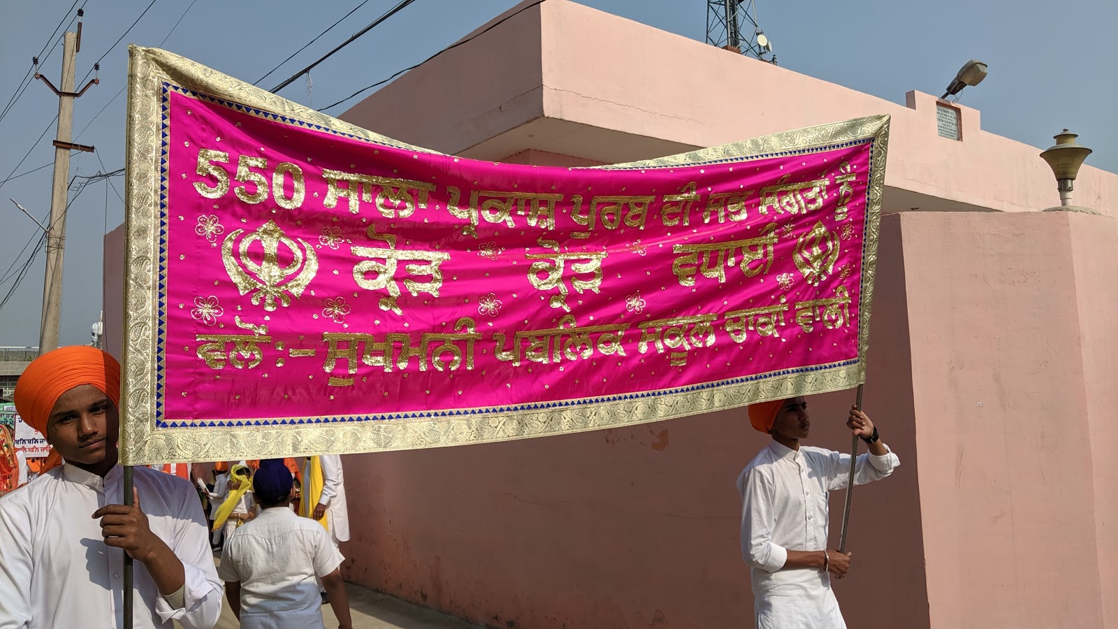 भी प्रकार का यहां उपलब्ध नहीं था।30 मिनट की इस यात्रा में हम छोटे से डेरा बाबा नानक गांव से होते हुए ,रास्ते में, गुरु नानक जी के 550वें जन्म उत्सव जिसे यहां सब प्रकाश उत्सव के नाम से संबोधन कर रहे थे ,सिख धर्म के अनुयाई,जत्थों ,जुलूसों के रूप में ,भजन गाते,हथियार लहराते,बेंड बाजों के साथ ,तरह तरह के करतब दिखाते निकलते दिखाई दिए ,जिस कारण हमें और थोड़ा समय बॉर्डर तक जाने में ओर लगा ।