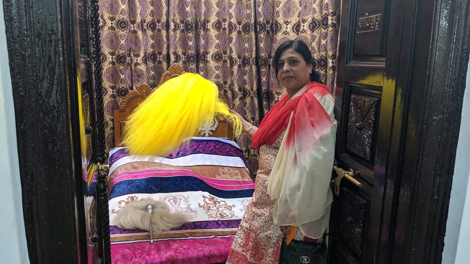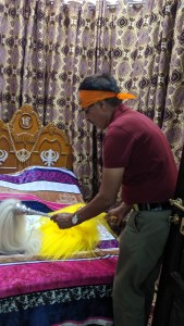 उपरी मंजिल के ठीक मध्य में एक बड़ा सा हाल था जिसके मध्य में विशाल स्वर्ण के सुंदरतम छत्र के नीचे गुरु ग्रंथ साहिब विराजमान थे ।सामने बिछे गलीचे पर थोड़े थोड़े श्रद्धालु आंखे बंद किए ,हाथ जोड़े प्रार्थना में तल्लीन थे।मंद मंद स्वर में ग्रंथ साहब के पाठ ,मुख्य ग्रंथि पढ़ रहे थे।इस कमरे के अंदर एवम् बाहर ,चारों ओर दर्शनार्थी पंक्ति बनाके खड़े हुए थे ।ऐसा भाव भिना शन हमें जिंदगी भर स्मरण रहने वाला था।हम भी संयोग से मिले अवसर का पूरा लाभ उठा रहे थे ।