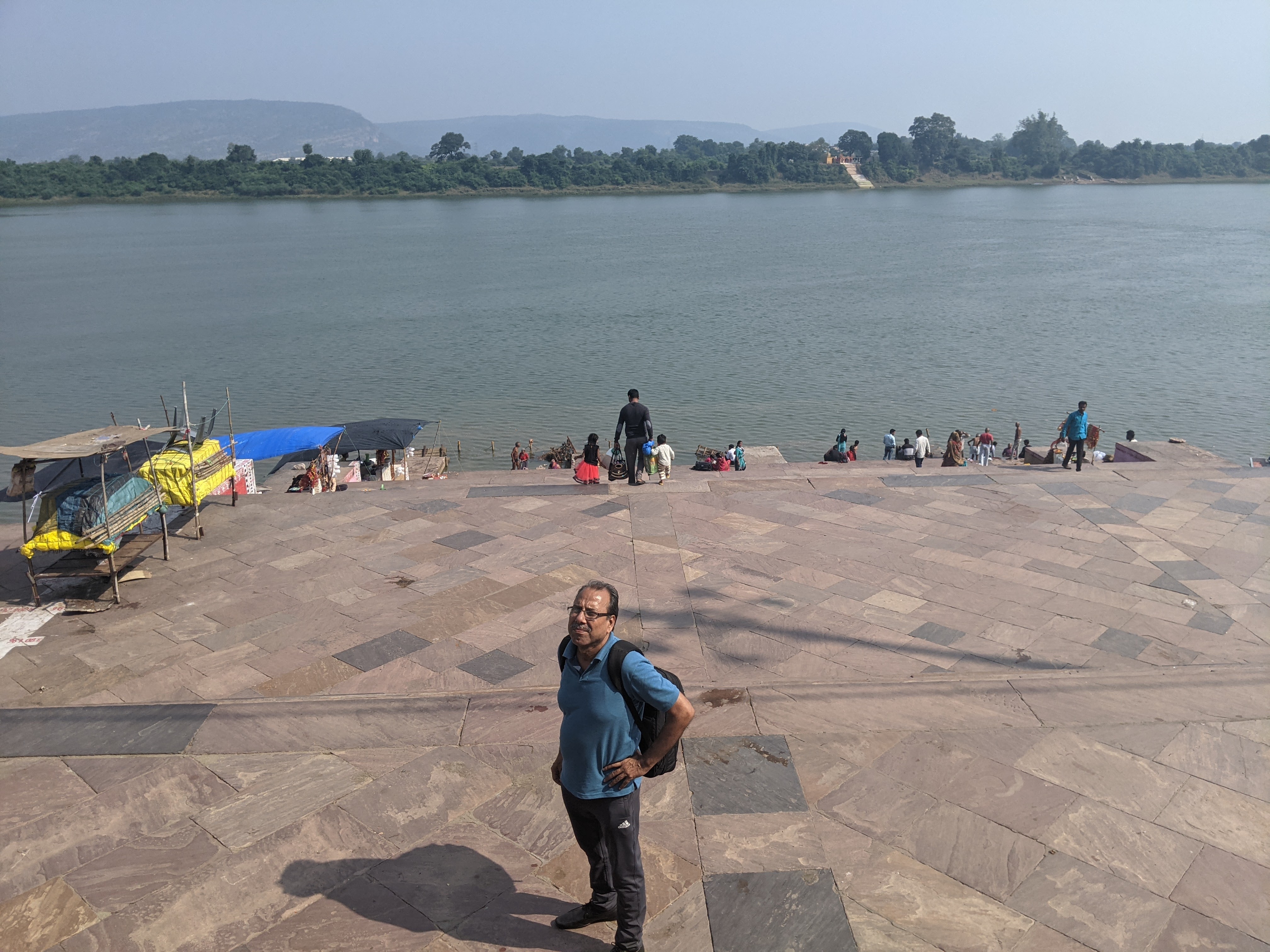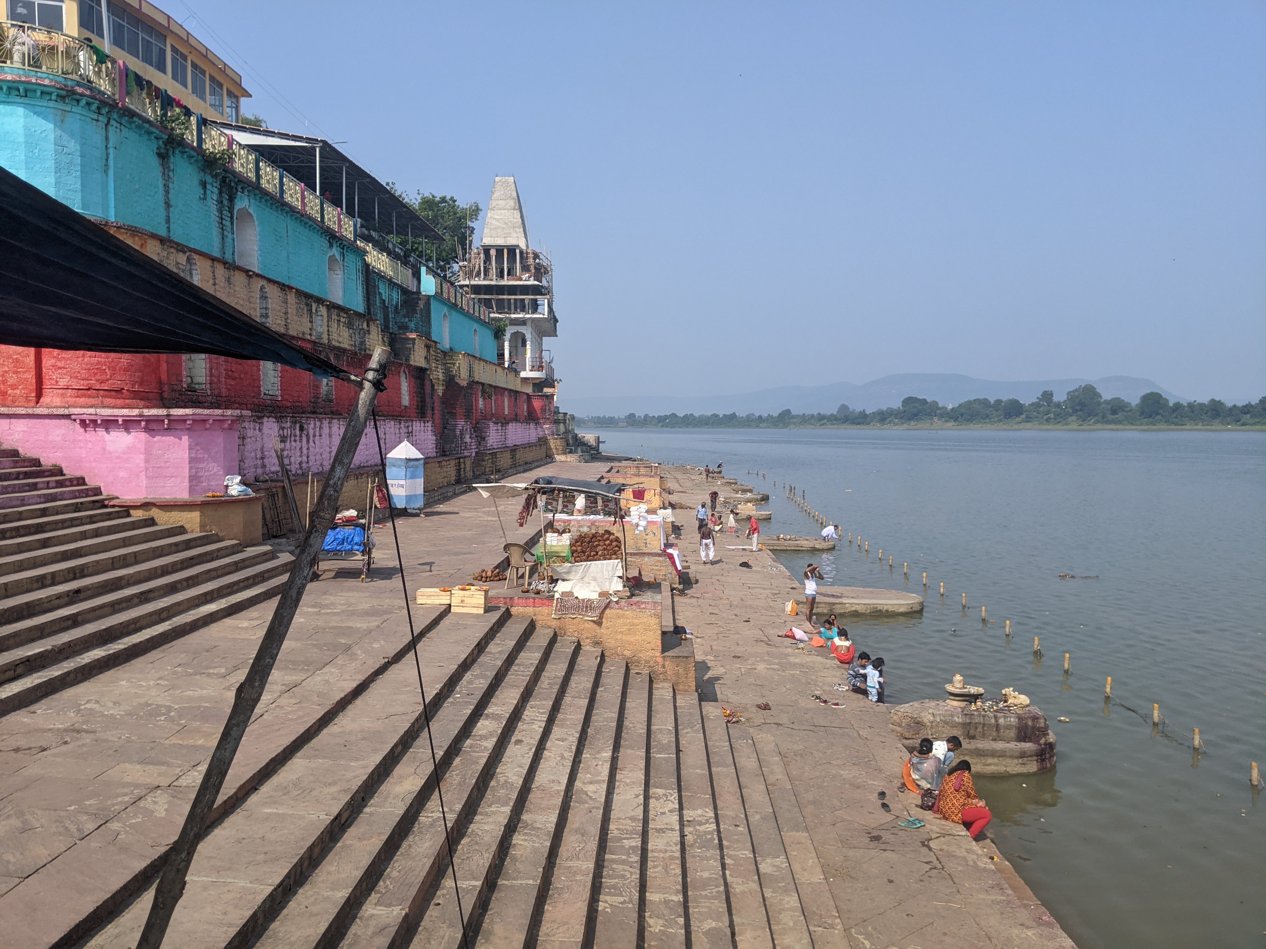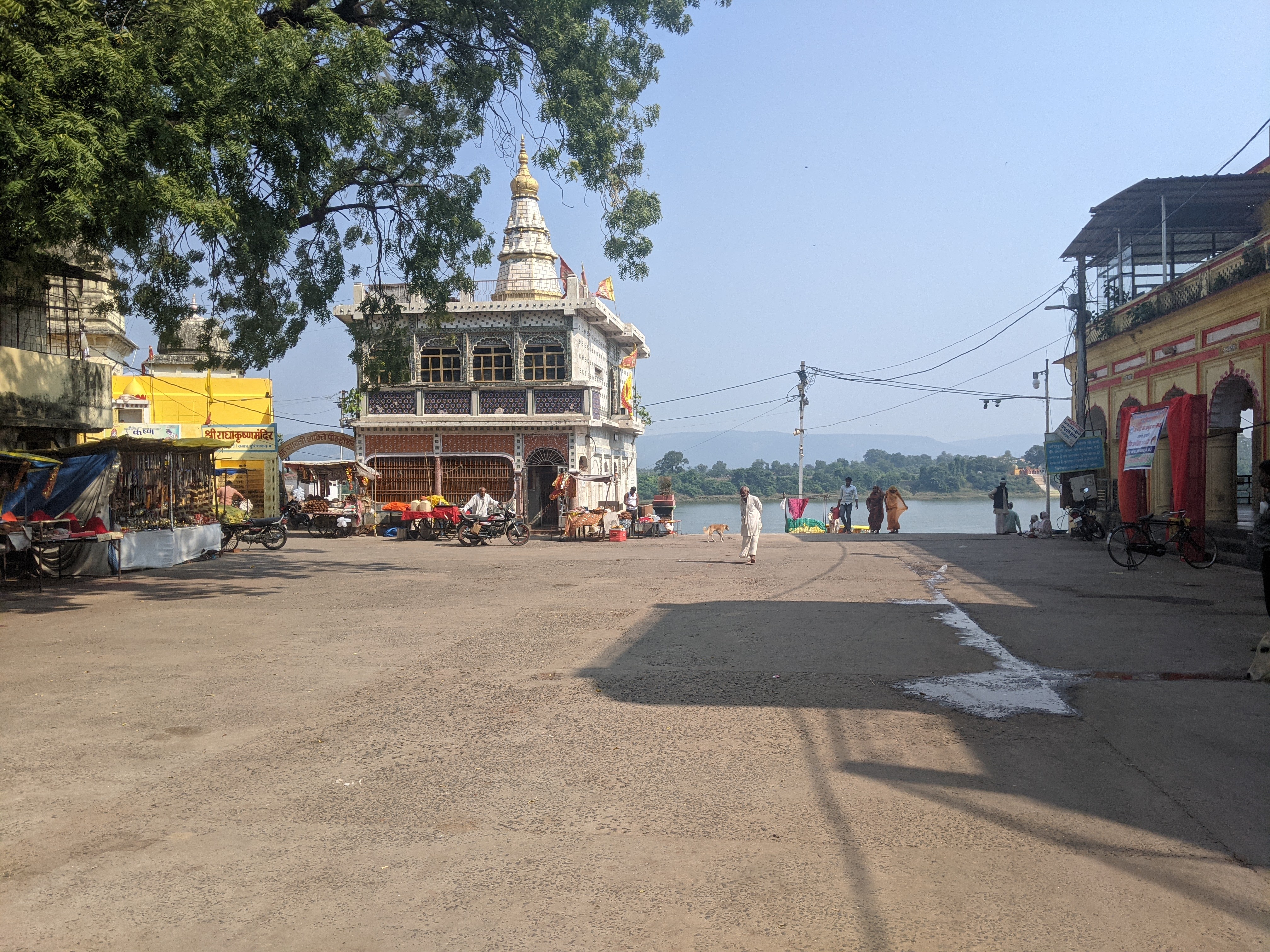 एक किनारे सिर्फ एक बड़ा सा मंदिर राधा कृष्ण का बना हुआ था ।साफ पता चल रहा था कि ये तीर्थ स्थान ,गंगा या यमुना के किनारे बने घाटों की तरह ,तीर्थ यात्रियों से भरे हुए नही थे ।एक दम खाली खाली से ,कोई चहल पहल नहीं।ये सब देख मन कुछ खिन्न सा हुआ । हम तो सोच रहे थे कि इतनी पवित्र ,बड़ी नदी के घाटों पर खूब रौनक होगी ,पर शायद यात्रियों के नाम पर तो सिर्फ हम दो ही थे !!