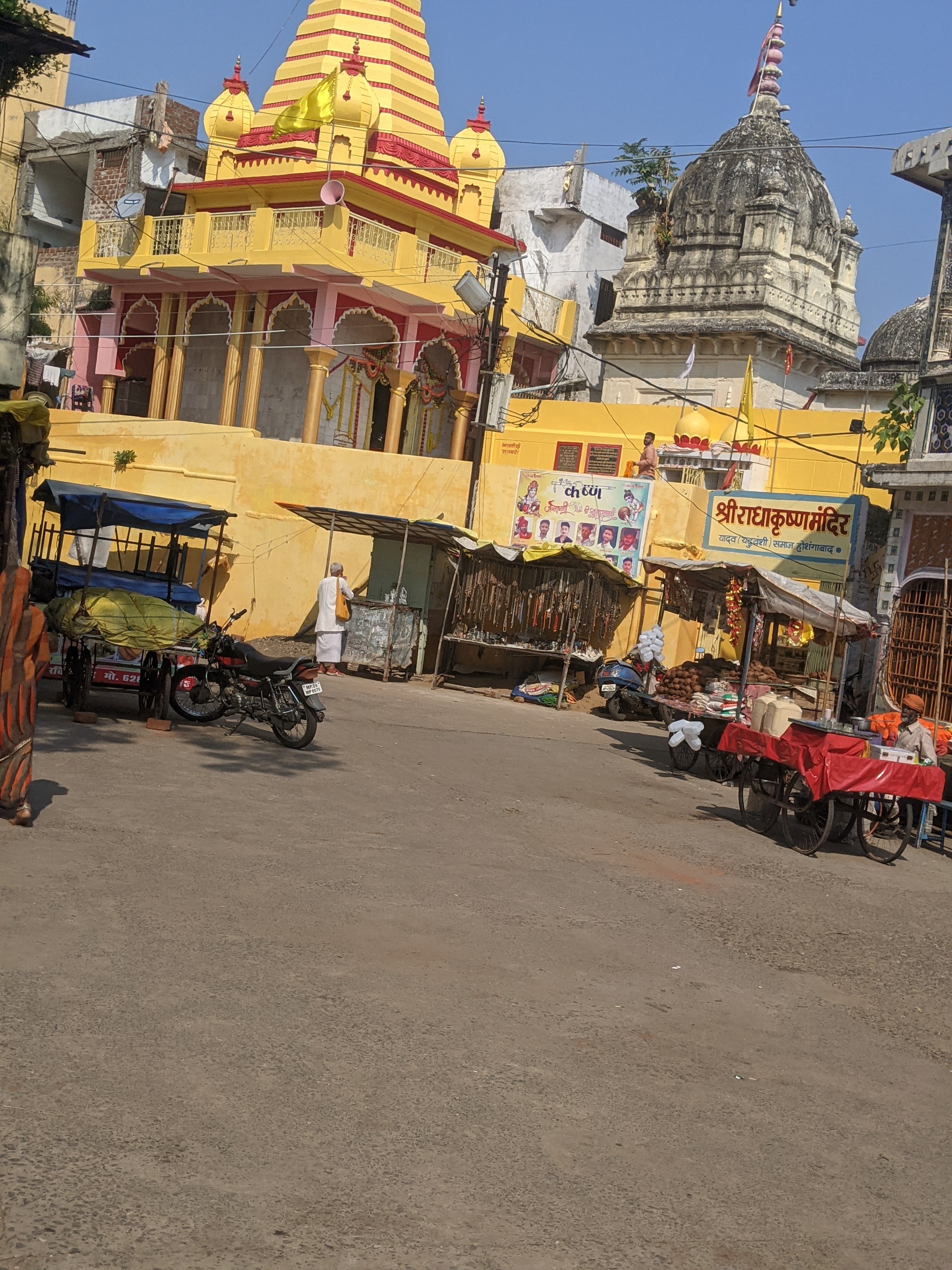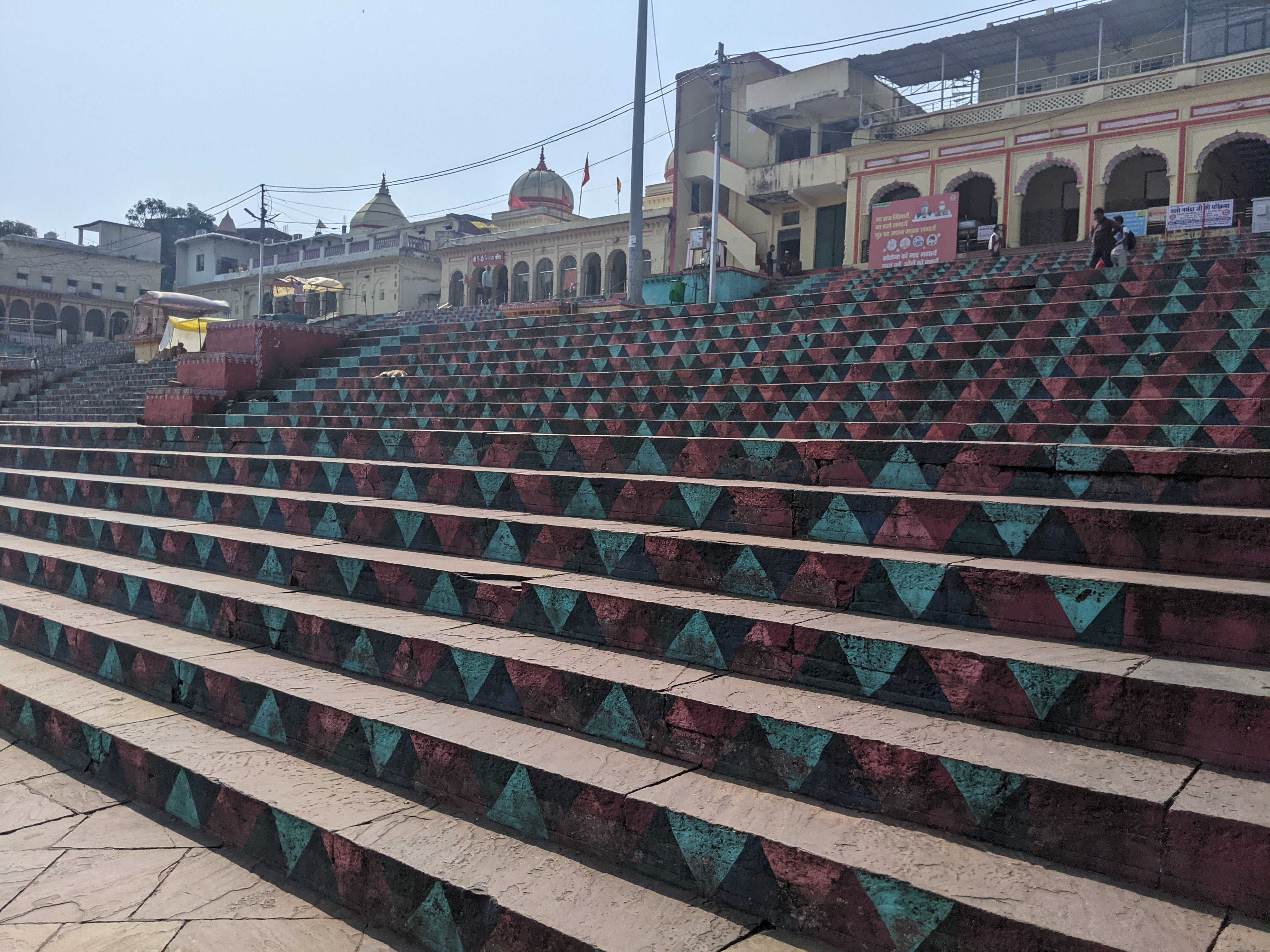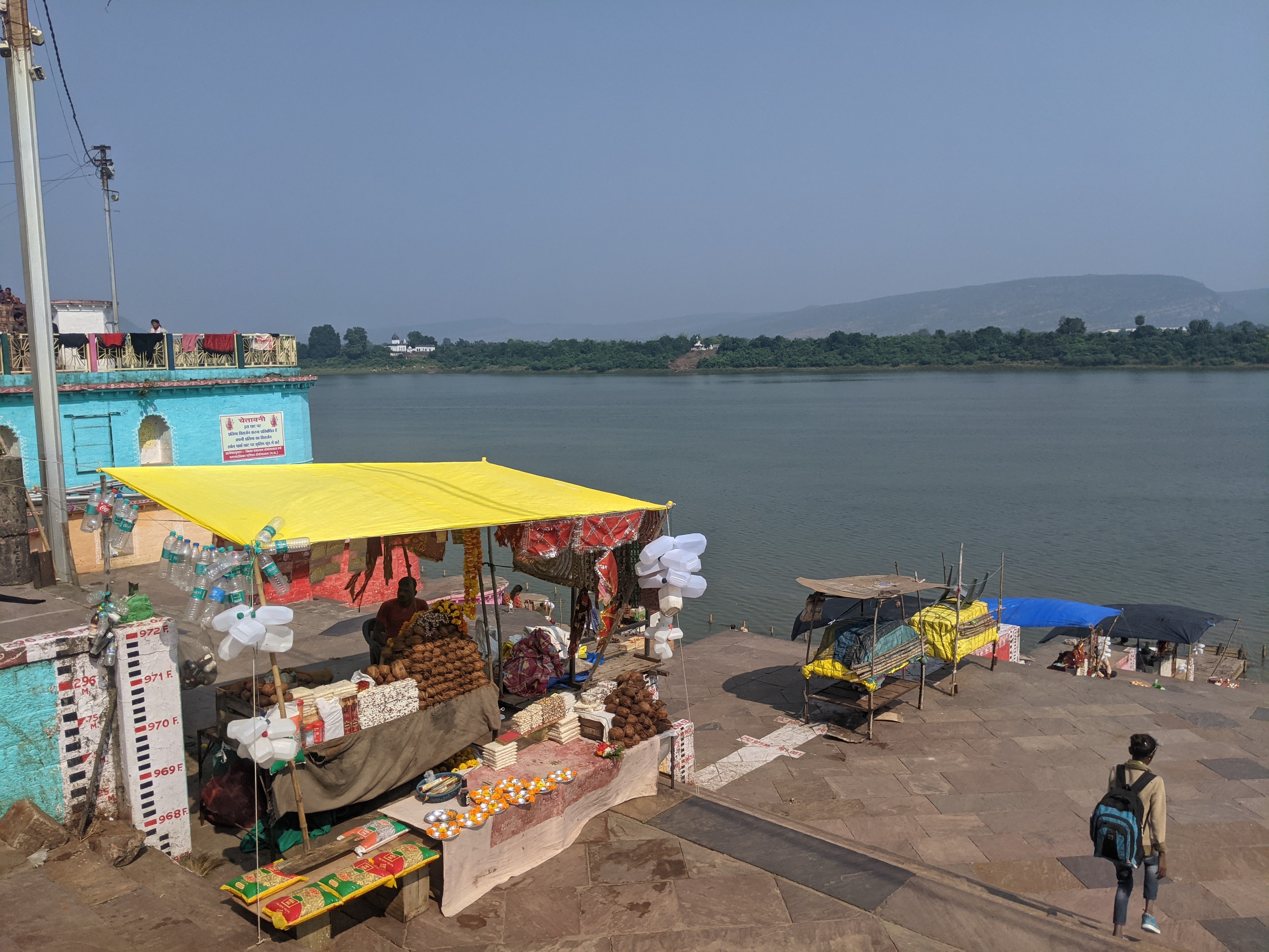 एक किनारे सिर्फ एक बड़ा सा मंदिर राधा कृष्ण का बना हुआ था ।साफ पता चल रहा था कि ये तीर्थ स्थान ,गंगा या यमुना के किनारे बने घाटों की तरह ,तीर्थ यात्रियों से भरे हुए नही थे ।एक दम खाली खाली से ,कोई चहल पहल नहीं।ये सब देख मन कुछ खिन्न सा हुआ । हम तो सोच रहे थे कि इतनी पवित्र ,बड़ी नदी के घाटों पर खूब रौनक होगी ,पर शायद यात्रियों के नाम पर तो सिर्फ हम दो ही थे !!
