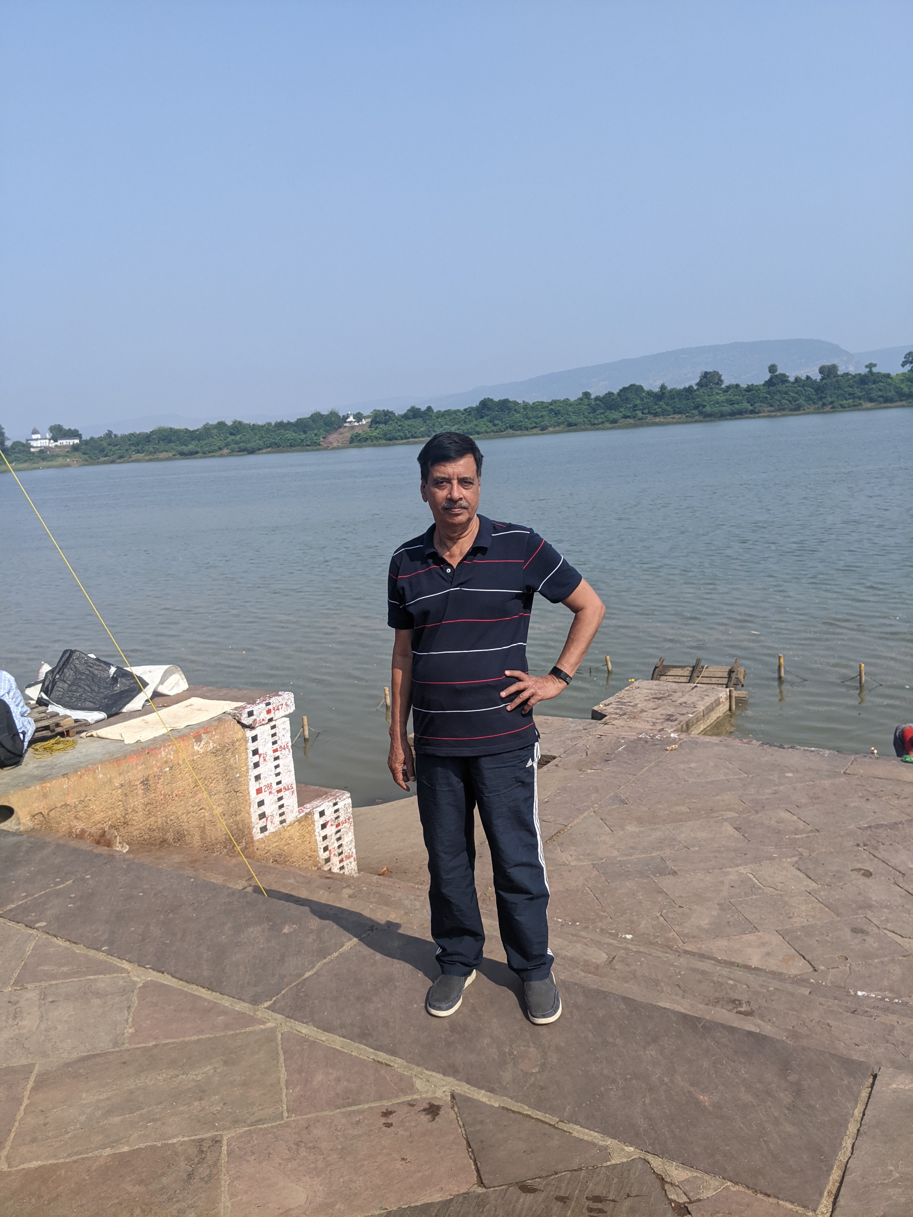 ऊपर से नीचे नदी तट की दूरी भी पचास फुट के लगभग थी।इस आधे किलोमीटर लंबे ,पक्के घाट पर जो कि एक दम जन शून्य था ,क्योंकि अब दस के करीब बज चुके थे ,धूप बहुत तेज थी ,हम नदी की धारा की ओर उतरने लगे।उतरते हुए हमे पक्के चबूतरे पर केवल तिरपाल ढकी एक दुकान सी दिखाई दी जिसमे पूजा के लिए कुछ फूलों से भरे दोने रखे थे ,जो कि स्नान के पश्चात पूजा के लिए होते हैं ,हमने उस पर अपने बैग रखे ,कपड़े उतार वहीं रखे और स्नान के लिए नीचे उतरने लगे।अब ,ये क्या ! स्नान के लिए छोटे छोटे पक्के घाट तो बने हुए थे परंतु उनके किनारे फूस ,मिट्टी से बने मूर्तियों के अवशेषों से भरे होने के कारण मत मैले पानी से भरे हुए थे , ऐसे में उनमें स्नान करने की इच्छा ही नहीं हुई। मैं ,हैरान था ,नर्मदा नदी तो अपने स्वच्छ ,पारदर्शी जल के लिए जानी जाती है तो ये यहां ऐसी मत मैली क्यों है।निराश ,हमने नदी के मध्य एवम दूर दिखाई देते किनारे की ओर नजर दौड़ाई तो लगा कि वहां जल एक दम साफ़ है ।कुछ देर दिमाग पच्ची के बाद समझ आया कि कुछ दिन पहले ही गणेश चतुर्थी का त्योहार निकला है जिसके बाद गणेश जी की मूर्तियों को यहां नदी जल में विसर्जित किया गया होगा ,जिसकी वजह से नदी किनारे का ये हाल हो रहा है।काश ! किसी एक तो विसर्जन करने वाले ने ,विसर्जन के बाद ,नदी किनारे का ये हाल देखा होता ।