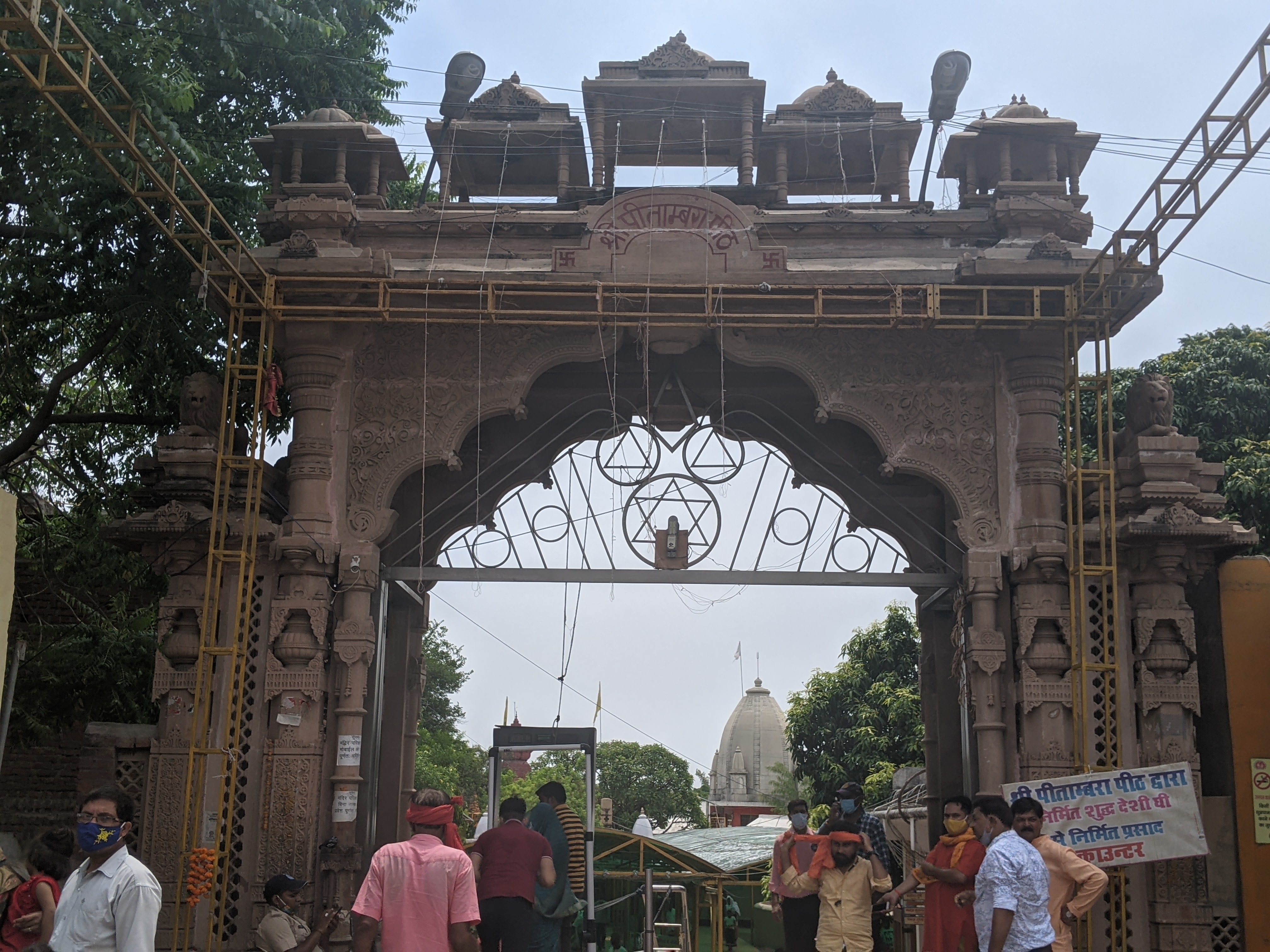 मां पीताम्बरी देवी के दर्शनों के लिए हमने मुख्य मार्ग छोड़ दिया और शहर की भीड़ भाड़ वाली सड़कों का रुख कर लिया।पांच किलोमीटर की यात्रा में इस कारण समय लगना ही था ,और वो लगा ,फिर सामने नजर आया मंदिर का मुख्य दरवाजा,जो की दर्शनार्थियों तथा सामान्य आने जाने वालों के कारण एक दम भरा हुआ था ।