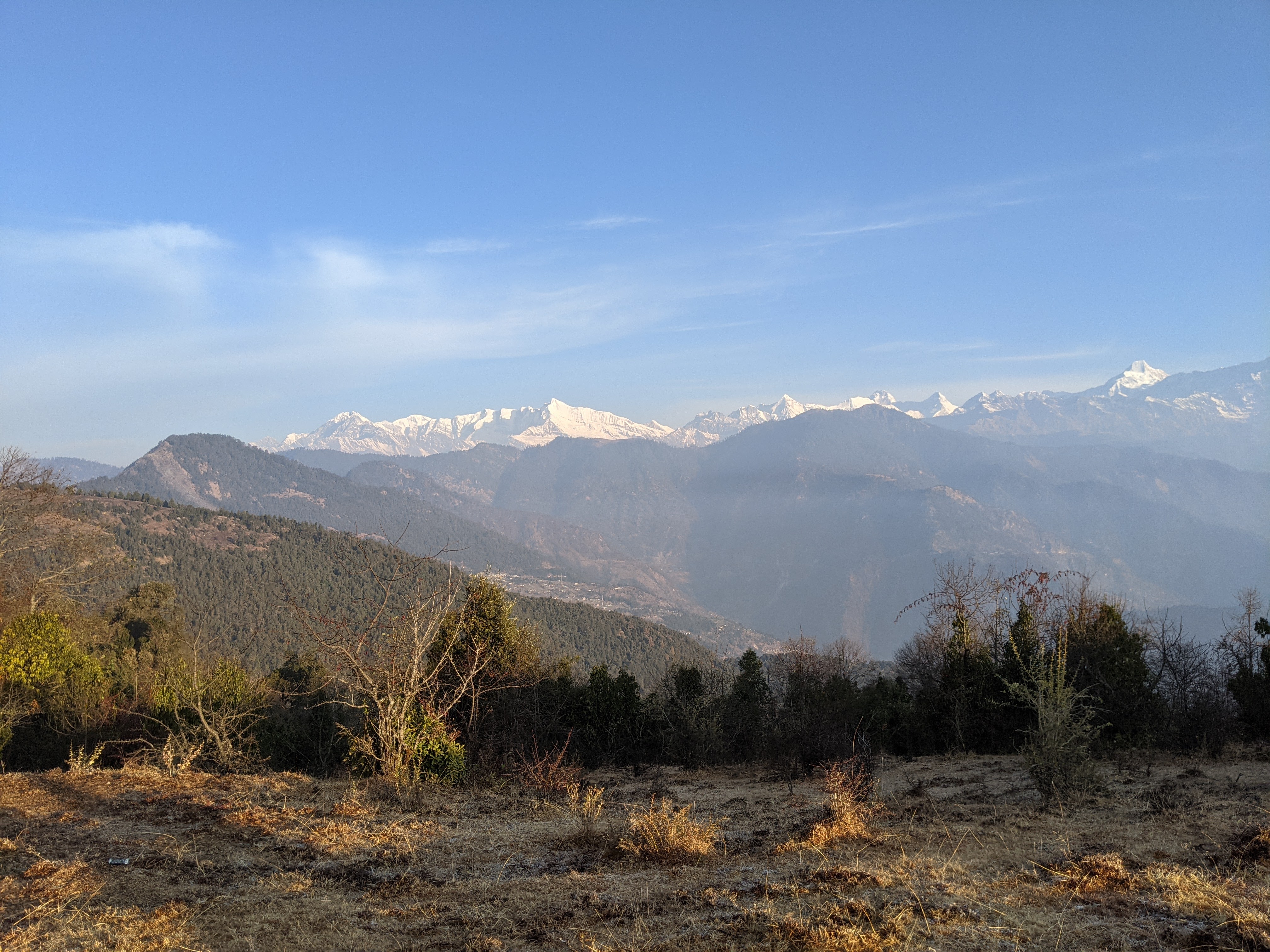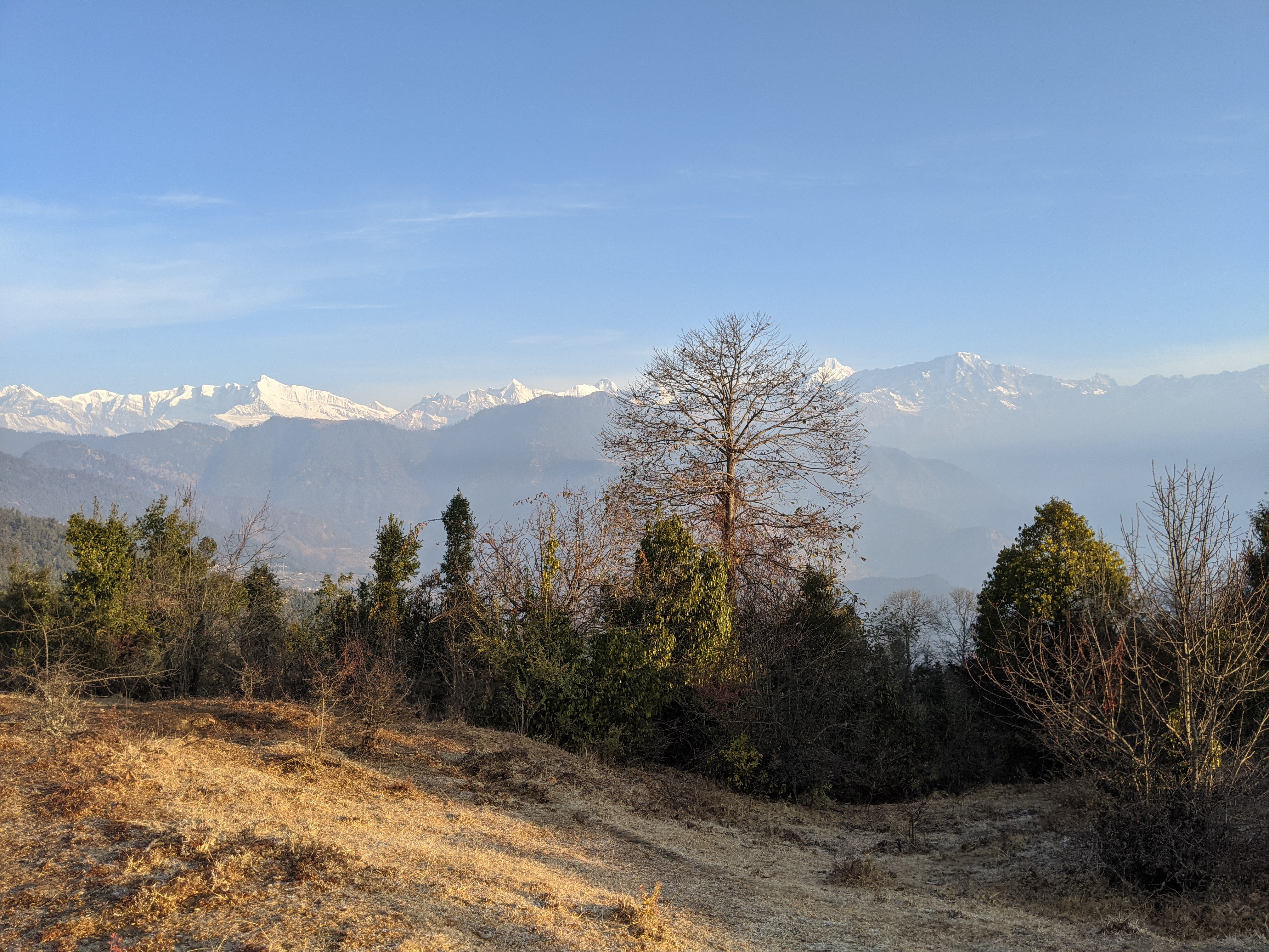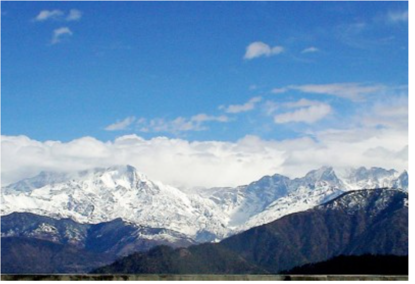 हमारे मेजबान ने मैदान के एक थोड़े ऊंचे उठे कौने में चलने का संकेत किया ।हम चल दिए ।जैसे ही उस तीस चालीस फुट ऊंचे,चौड़े ,कौने पर पहुंचे ,वहां हमने जो नजारा देखा ,कुछ क्षण के लिए तो हम भौंचक्के ही , रह गए ।हमारे ठीक सामने थी ,सफेद ,झक ,बर्फ से पूरी तरह ढकीं ,विशाल ,हिमालय की ,विशाल चोटियां ।उस समय ,बिल्कुल ऐसा लगा कि जैसे अगर हम अगर हाथ बढ़ाएं तो उन्हे छू सकते हैं।उनके और हमारे बीच अब कोई और पहाड़ नही थे ।हम जिस चोटी पर खड़े थे ,वो अंतिम ,हरा भरा ,पहाड़ था ,जिसके ठीक बाद ,,महान हिमालय की महान ,बर्फ से लदी चोटियां थी ।उन सब के ठीक नीचे बड़े बड़े बर्फ के ग्लेशियर थे । कुछ क्षणों तक हम सब निशब्द ,सम्मोहित से खड़े ,इस अद्भुत पलों,दृश्यों का आनंद लेते रहे ।इस समय ,दूर दूर तक ,चारों तरफ , जहां तक भी हम देख सकते थे , केवल ,हम और हम ही थे । हम इतनी अधिक ऊंचाई पर थे कि लगा रहा था जैसे कि हम, नीले खुले आसमान के नीचे, पहाड़ जैसी किसी विशाल छत के ऊपर खड़े हुए सामने बर्फ की विशाल दीवार के सामने , बौने दिखाई देते,आस पास के छोटे बड़े पहाड़ देख रहें हों ! उस स्थान पर इतनी निरवता थी कि अगर इस निरवता को ,कोई भंग कर रहा था तो वो थी सिर्फ ,हमारे कानों में सरसराती ,हवा के मध्यम मध्यम झोंके !!