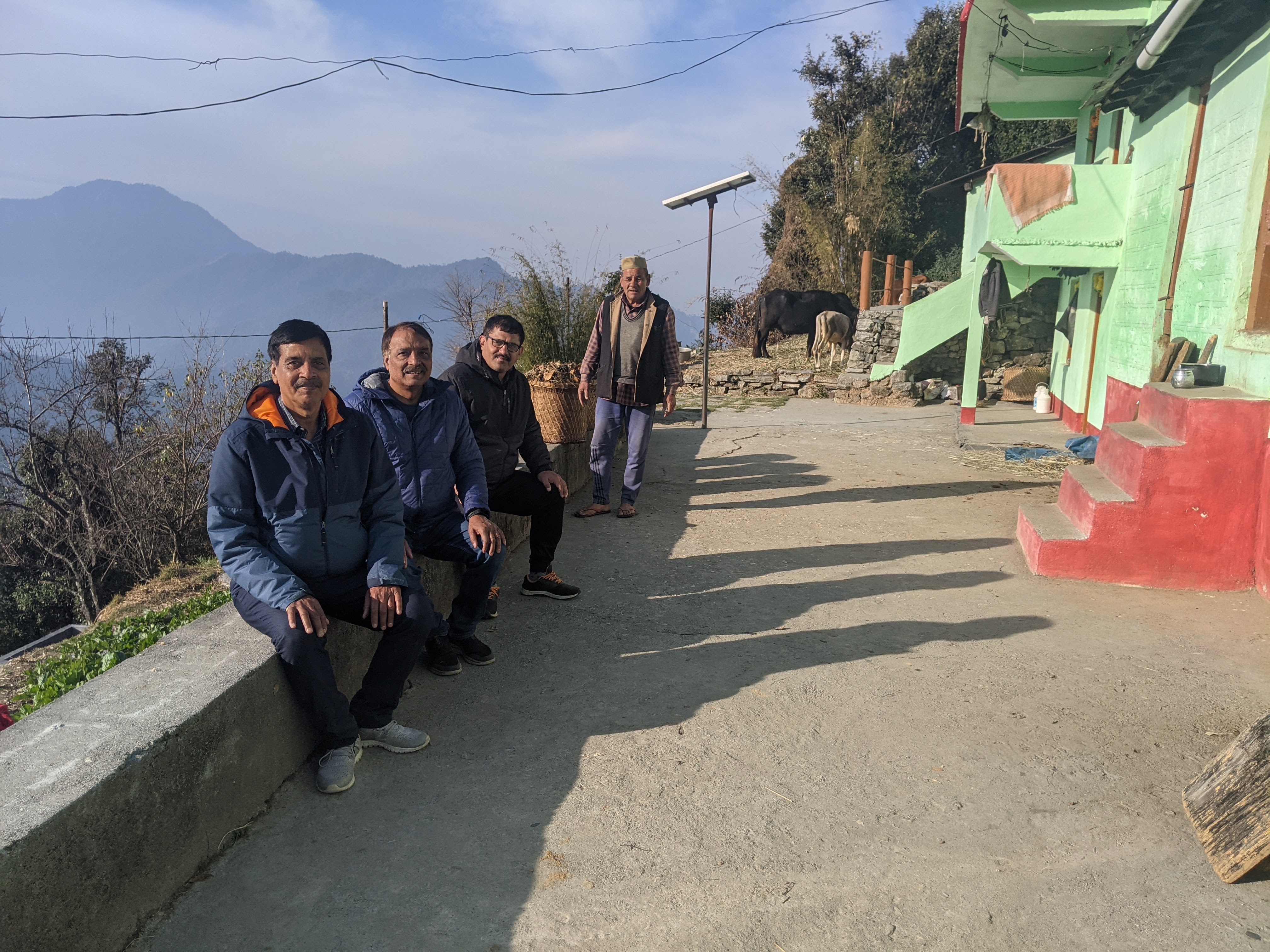 लगभग एक घंटे का समय , ,प्रकृति के इस अद्भुत नजरों को देखते हुए बिताने के बाद हम वापस होम स्टे की ओर चल पड़े ।मन तो कह रहा था कि कुछ और समय हम यहां बिताते ,परंतु अभी हमे आगे भी ,दस घंटे की यात्रा पर आगे बढ़ना था ,इस लिए मन को समझाते हुए लौट ने को मजबूर होना ही पड़ा ।वापस होम स्टे आते समय ,मेजबान ,वापसी के मार्ग से कुछ है कर ,हमे एक स्थानीय निवासी के घर ,उनका राजन सहन दिखाने ले गए ।पहाड़ी के आंचल में बना एक दो मंजिला घर , जिसकी नीचे की मंजिल पर पालतू पशु जो कि बकरी एवम दो भैंसे थी ,का विश्राम स्थल था ,ऊपर की मंजिल पर ग्रह स्वामी का निवास स्थान था ।घर के सामने थोड़ा सा चौड़ा खुला आंगन ,उसके ठीक किनारे सीधे तीस फिट के करीब सीधी ढलान ,फिर थे उनके सीढ़ीदार खेत ,जिनमे ,मटर ,मक्का ,मूली ,आदि तरह तरह की सब्जियां वे उगाते थे ।इस तरह वे बिना किसी और के सहारे निर्भर हुए, स्वयं जीवी थे ।बड़े ही प्रेम से उन्होंने हमारा स्वागत किया ।गरम गरम दूध ,आतिथ्य के रूप में दिया ,साथ ही हमें अपना घर अंदर से देखने को आमंत्रित भी किया ।
